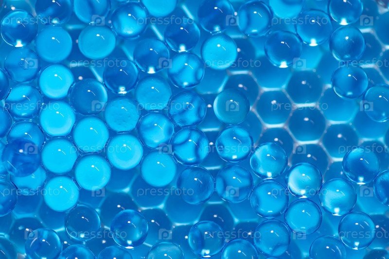 Синие гидрогелевые шарики в два слоя: хаотичный верхний в фокусе, нижний слой, лежащий упорядоченными шестиугольниками, размыт. Абстрактный фон, текстура, похожая на инопланетный материал, клетки
