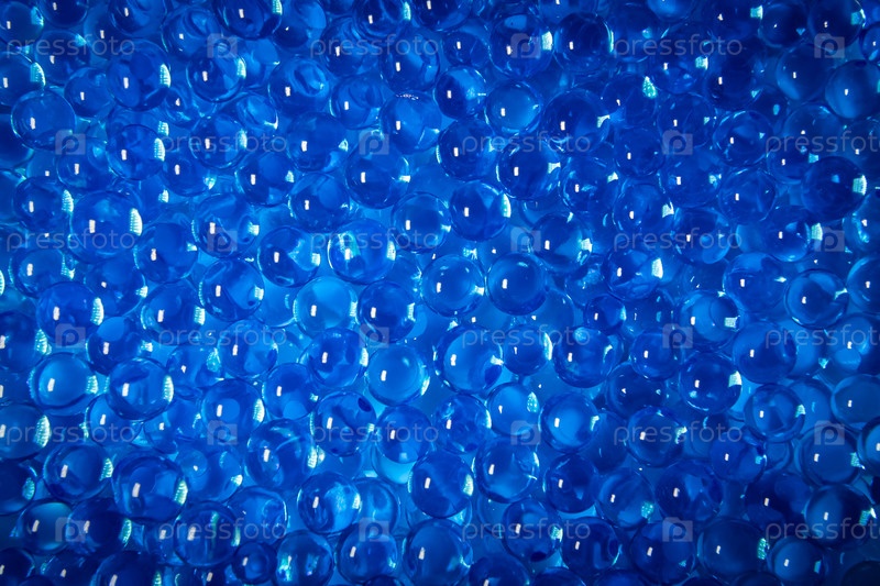 Крупный план множества маленьких синих гидрогелевых шариков, наполненных водой. Шары лежат плотным, однородным слоем, похожие на причудливую синюю икру