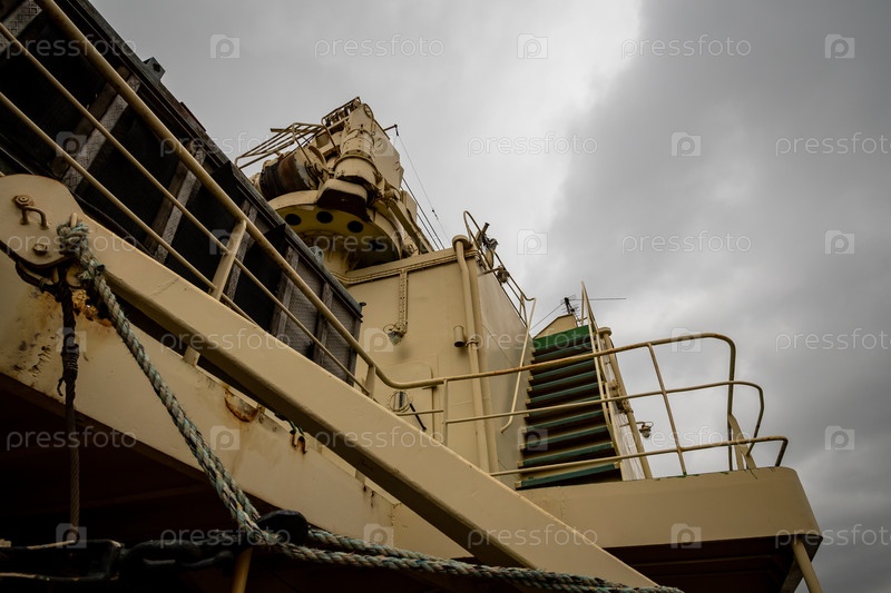 Вид снизу на надстройку старого русского ледокола под серым пасмурным небом