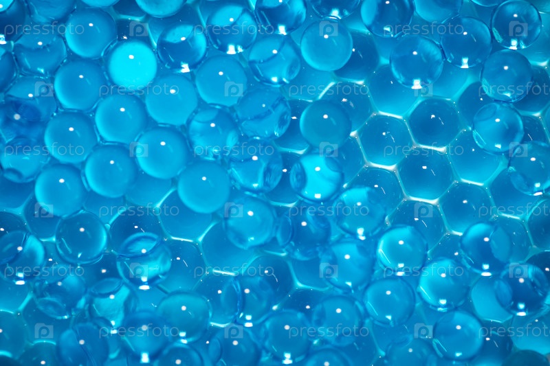 Синие гидрогелевые шарики в два слоя: хаотичный верхний размыт, нижний слой, лежащий упорядоченными шестиугольниками, в фокусе. Абстрактный фон, текстура, похожая на инопланетный материал, клетки