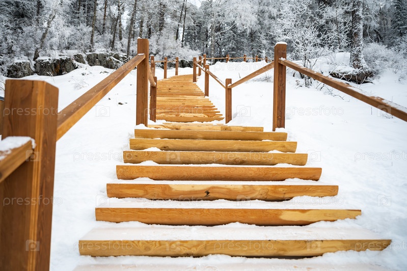 Снежные деревянные ступени в спокойном зимнем лесу