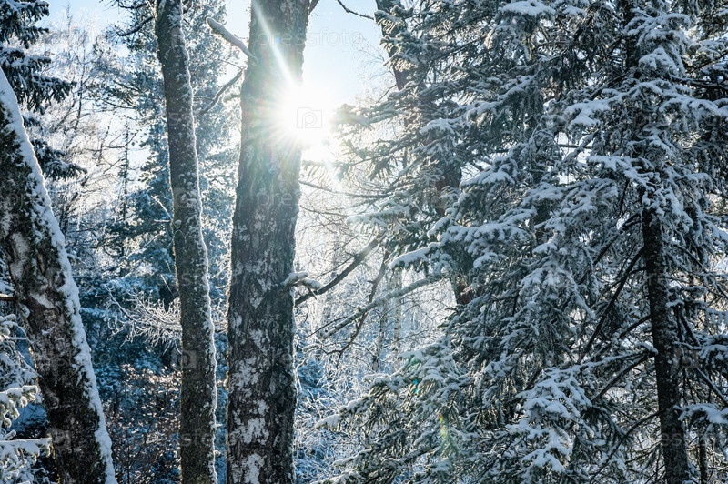 Солнечный свет фильтрует лесные деревья, покрытые снегом