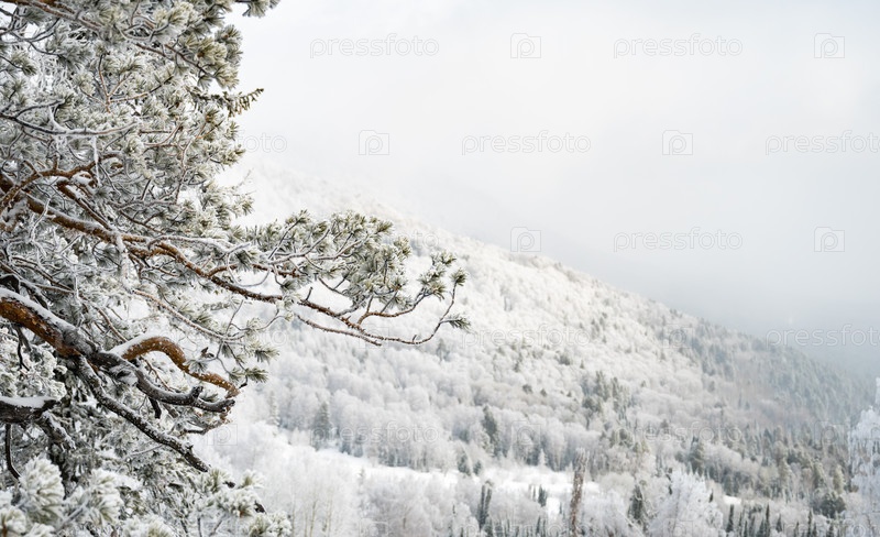 Снежно покрытые сосны на ясном голубом небе
