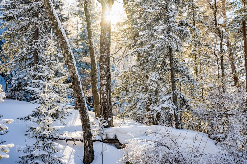Солнечный свет фильтрует лесные деревья, покрытые снегом