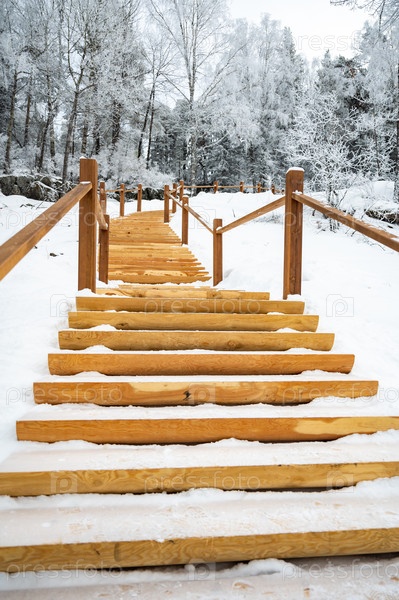Снежные деревянные ступени в спокойном зимнем лесу