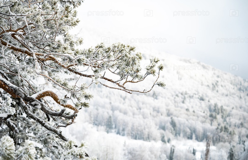 Снежно покрытые сосны на ясном голубом небе