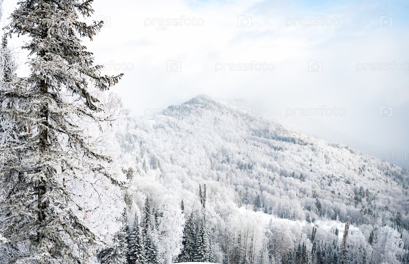 Снежно покрытые сосны на ясном голубом небе