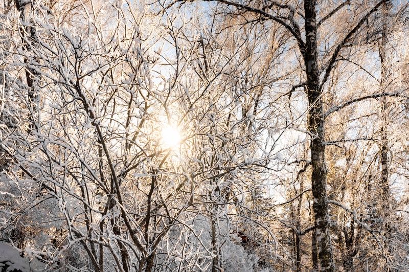 Солнечный свет фильтрует лесные деревья, покрытые снегом