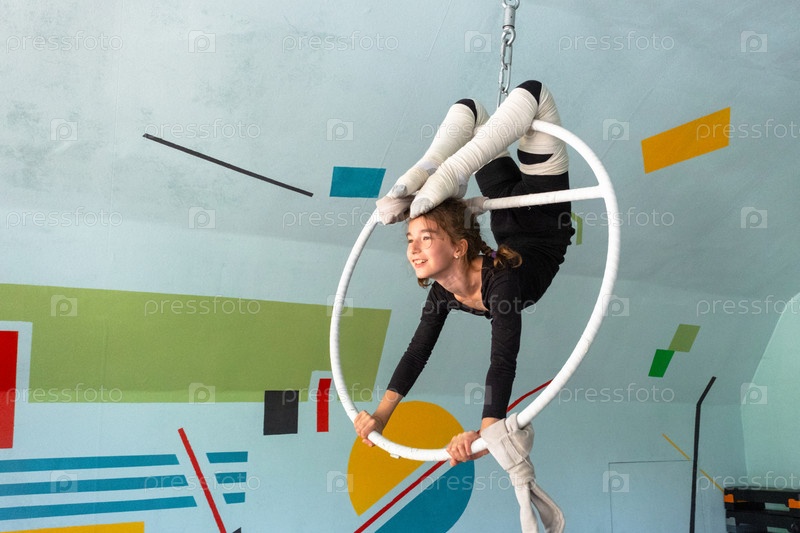 Гибкая девушка, делающая воздушные трюки в цирковой студии, акробатика, безопасность обеспечивается эластичными обертками, занятия детскими видами спорта