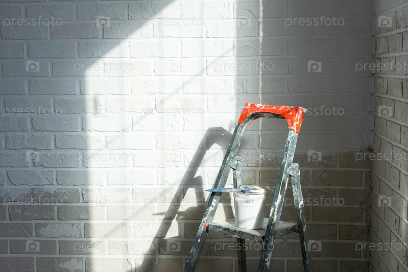 Живопись и отделка помещений, ступенчатая лестница с ведрой для краски, поверхностная подготовка к отделочной работе стен, реконструкция интерьера, профессиональное обновление