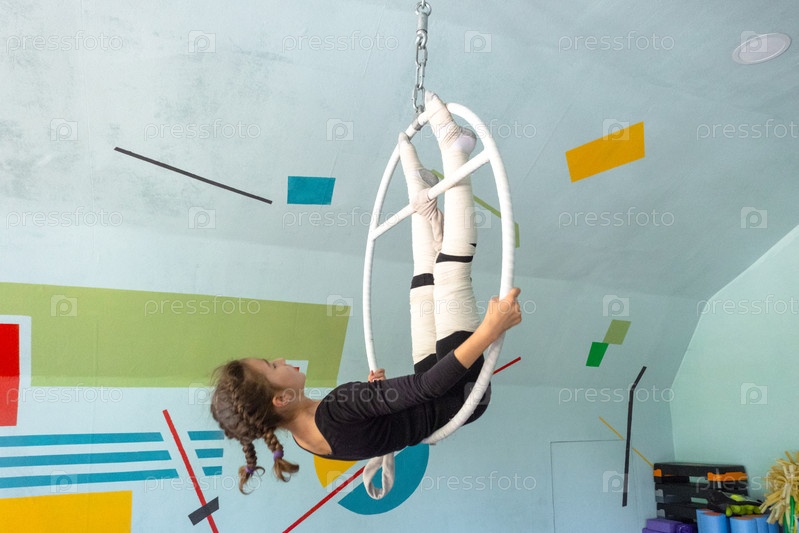 Молодая девушка практикует акробатику с воздушным кольцом в цирковом тренажерном зале, защитные обертки защищают ноги, гибкость тренировки и цирковое мастерство