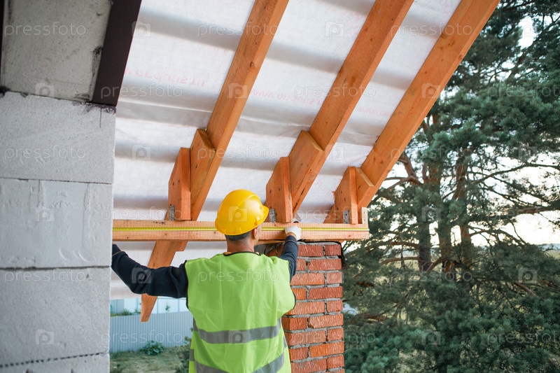 Мастер строительной площадки проверяет равномерность бревен для изолированной крыши, современную постройку в процессе, визуализируемое размещение задержки дерева