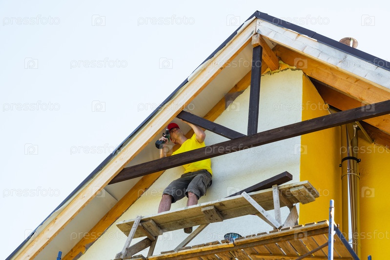 Builder in protective helmet secures vertical wooden beam to home gable from mobile scaffold, желтые детали стен, внимание к командной работе, внешняя отделка
