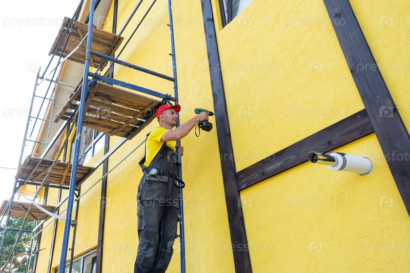 Строительный работник закручивает деревянный элемент на фасад, декор из полудекорированной древесины, экстерьер дома, архитектурную отделку, частный проект, ремонт и облицовочную работу