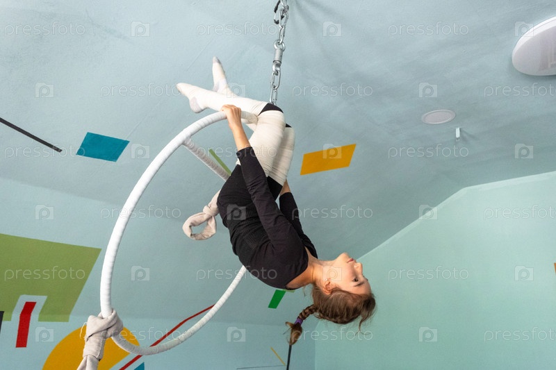 Девушка вверх дном на воздушной обрутке, практикующая цирковую акробатику, выполняя трюки в безопасной среде, ноги защищены эластичными оболочками