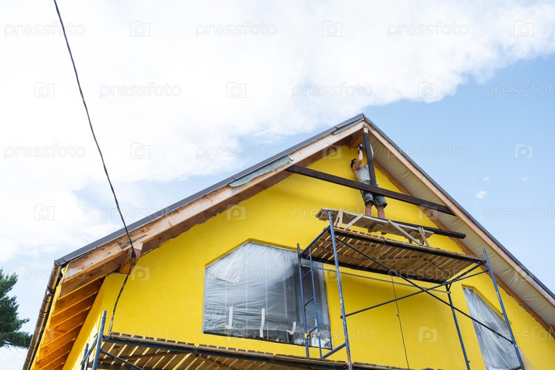 Желтый современный дом с передней отделкой и установленной сетью скелетов, внешняя деревянная обработка в процессе, солнечный яркий день
