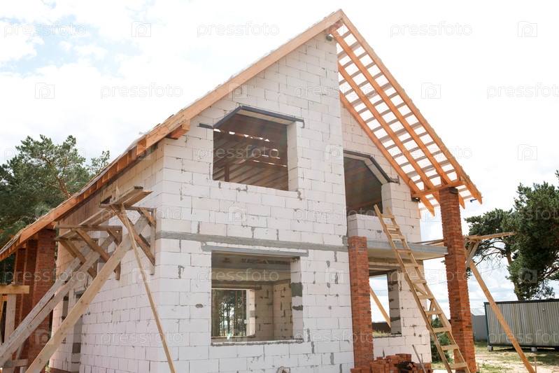 Евро-коттедж с новейшими технологиями stropil и lag в использовании, воздушный фасад, видимая деревянная рама, дом на стадии строительства со средней крышей