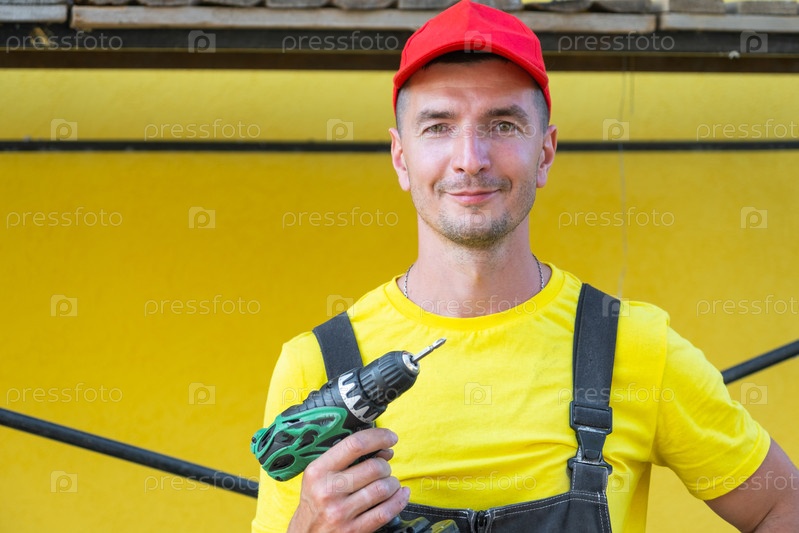 Портрет уборщицы в желтой футболке, держащей силовую дрель, частный ремонтный бизнес, ремонт клиентов на месте, строительство дома, установка инструмента DIY