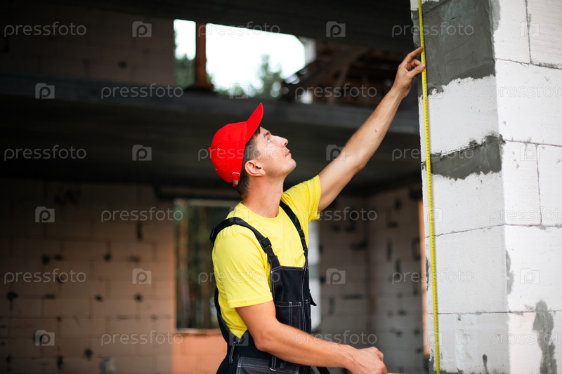 Строительный работник проверяет вертикальную высоту оконного отверстия, измерения площадки для установки, планирование перегородок стен, работы по реконструкции здания