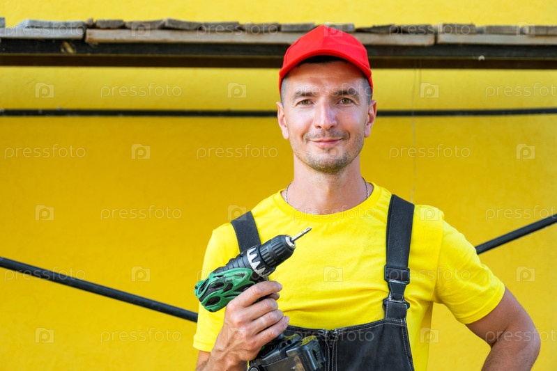 Строитель с беспроводным дрелем и набором инструментов, стоящий в строящемся доме, ремонт дома, профессиональный подрядчик бизнеса, навыки улучшения DIY