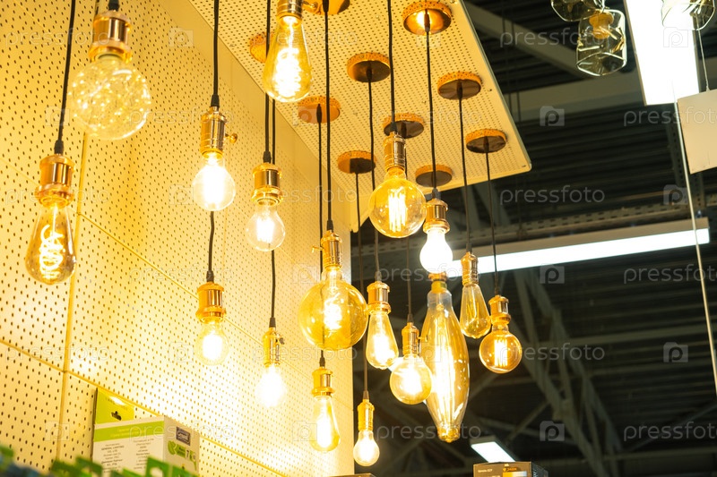 Ретро лампочки Edison на выставке, интерьерное освещение магазина, винтажные стеклянные светильники, декоративная установка потолка, креативное дизайнерское решение для стильной атмосферы