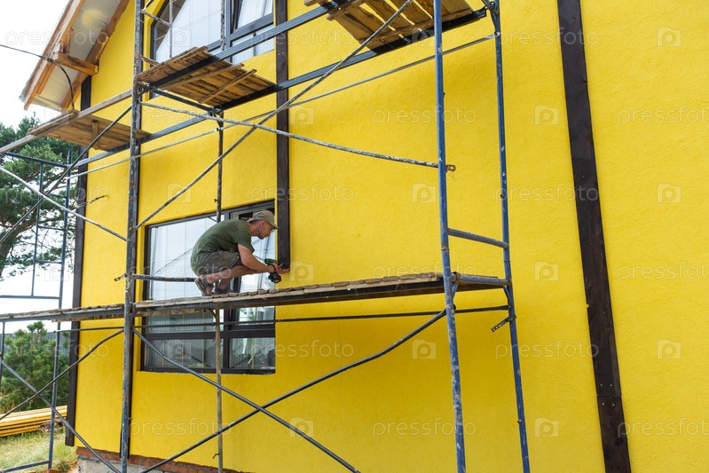 Окраска оконных областей на фасаде, окончательная наружная желтая стена, гипсовое покрытие, рабочий с кистью, декоративные деревянные панели, motif отделки, полустроительный стиль