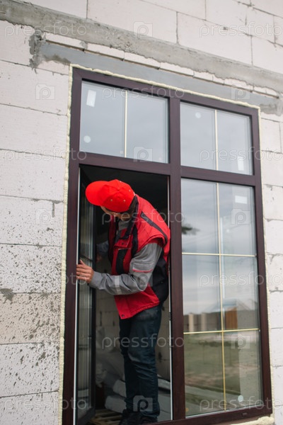 Техник настраивает пластиковое окно в кирпичную стену, процесс установки, регулирование нового PVC-окна, прецизионные работы, современное обустройство дома и улучшение жилища