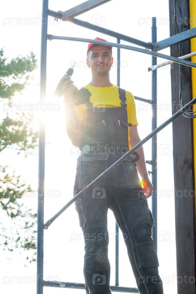Ремонтник в красной шапке с отверткой на лесомашинах, строительная площадка дома, самодельная сборка, работы по техническому обслуживанию, частное подрядное предприятие, строительные инструменты
