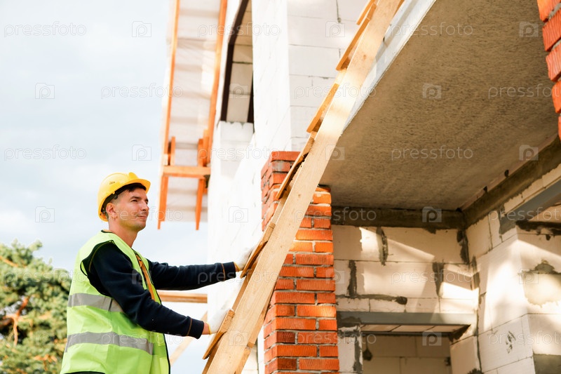 Специалист по строительству принимает меры к установке точек, выравнивает деревянные балки, шлем безопасности, прогресс здания, детали монтажа, организацию командной работы, профессиональный рабочий процесс