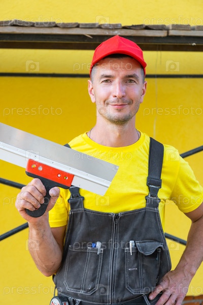 Портрет строителя с лепным ножом, ремонт штукатурки, бизнес по ремонту дома, мастерство в отделке отделочных работ, инструменты для домашнего обслуживания