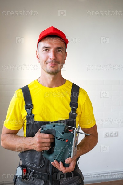 Ремонтник в красной шапке, держащий беспроводное сверло, фасад дома, универсальные инструменты для ремонта, услуги мастера по уходу за собой, работа на дому, обслуживание здания и установка