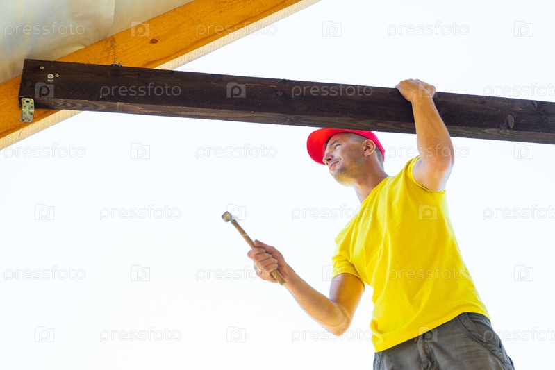 Строитель в шлеме безопасности осматривает большую деревянную перекрестную балки на фасаде дома, тонкие измерения, мастерство в процессе, современный дизайн