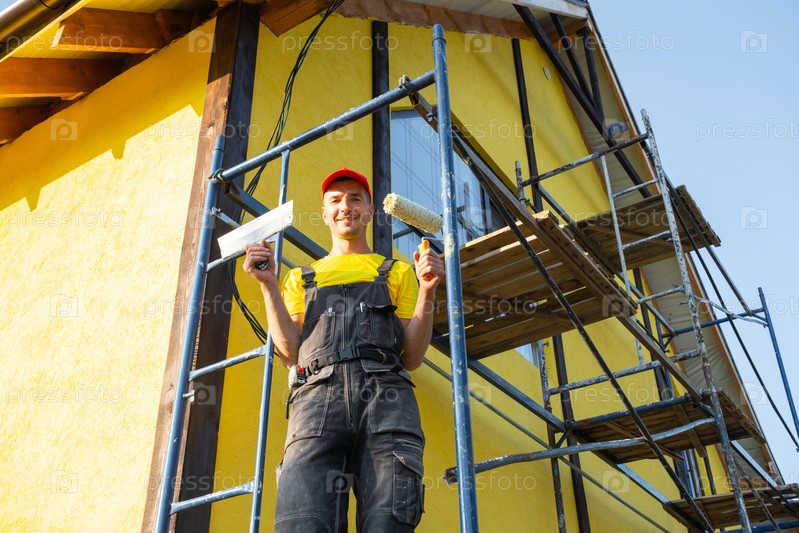 Строитель, стоящий с роликом краски, ремонт фасадов, лесомашины, реконструкция, инструменты, сервис по улучшению дома уборщика, консультации, эксперт в отделке отделочных работ