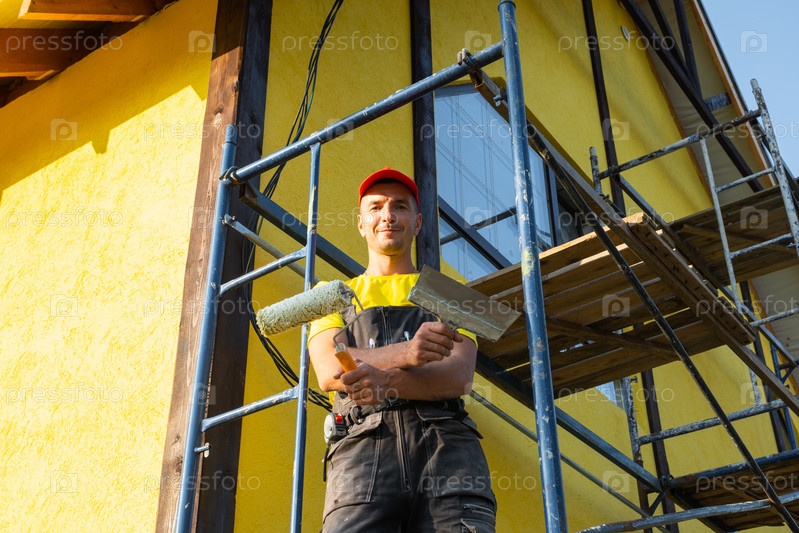 Ремонтник с роликом на лесовке, наружная живопись, ремонт стен, инструменты мастера по уходу за руками, улучшение фасада, домашнее обслуживание, командное ремесленничество, консультационный звонок