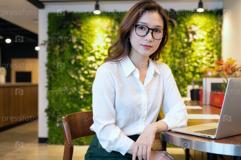 Портрет молодой взрослой азиатской женщины с очками, работающей на ноутбуке в помещении