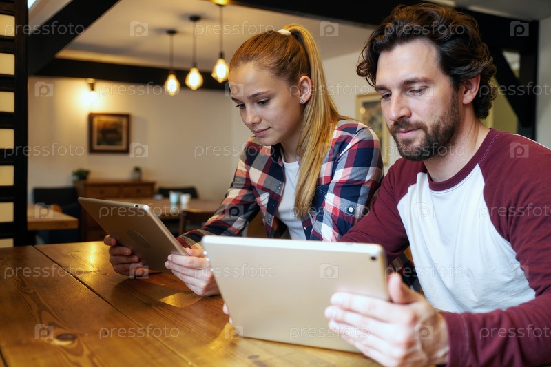 Белая молодая женщина и белый молодой человек используют цифровые планшеты в помещении