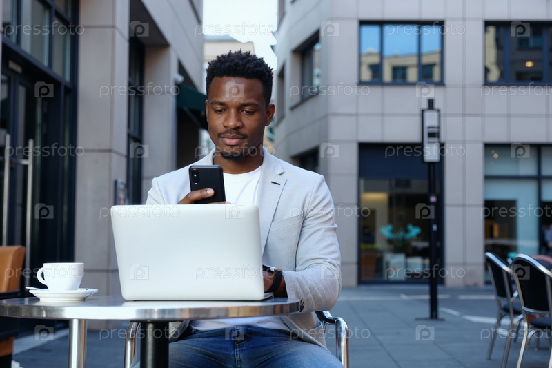 Молодой взрослый чернокожий мужчина использует смартфон и ноутбук за столом открытого кафе