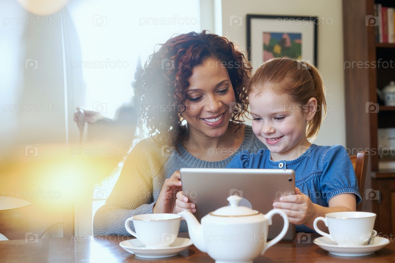 Улыбающаяся американская женщина и белая девушка используют цифровые планшеты вместе