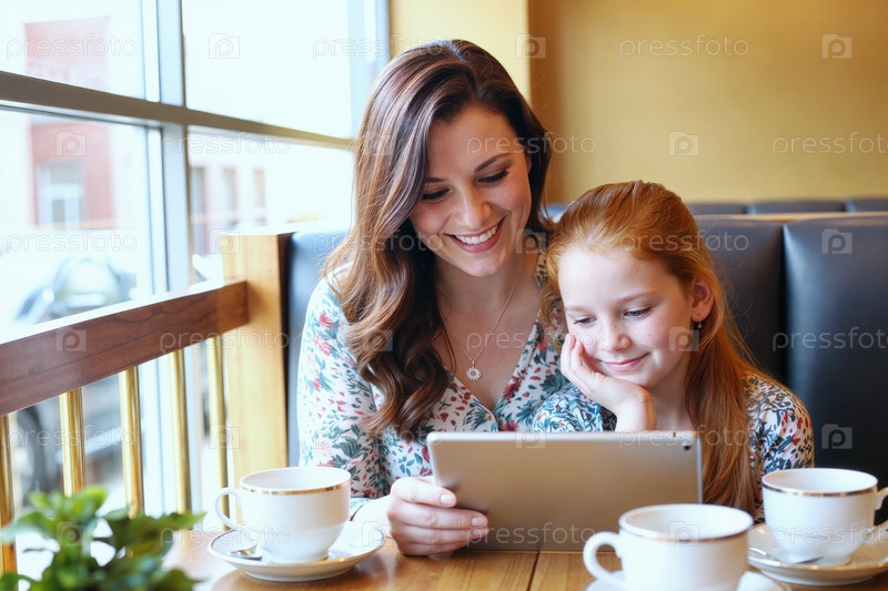 Кавказская молодая взрослая женщина и девочка-ребенок используют цифровой планшет в кафе