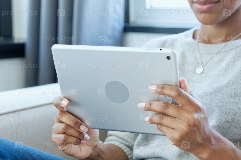 Молодая взрослая чернокожая женщина использует цифровой планшет, сидя в помещении