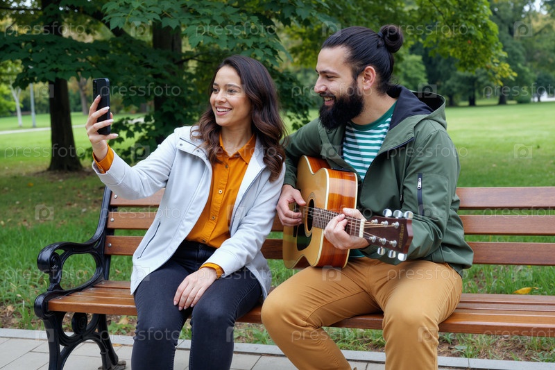 Молодая белая женщина делает селфи с молодым человеком, играющим на гитаре на свежем воздухе