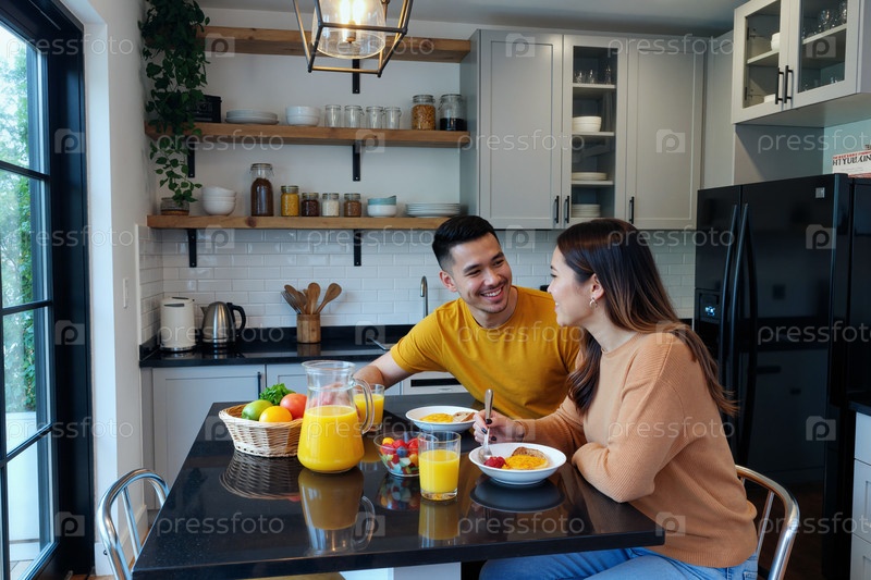 Молодой взрослый азиатский мужчина и молодая взрослая белая женщина завтракают вместе