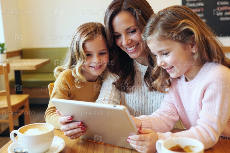 Юная кавказская мать сидит с двумя дочерьми, используя цифровые планшеты вместе