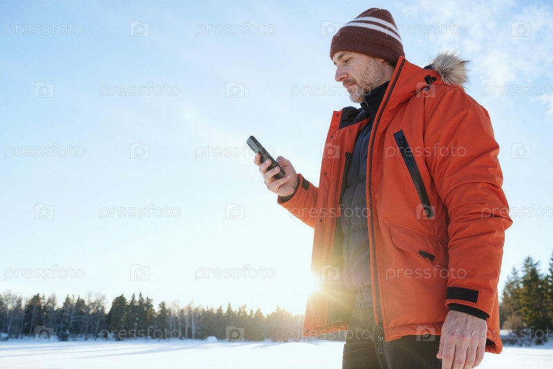 Кавказский мужчина среднего возраста, использующий смартфон на улице в зимний день