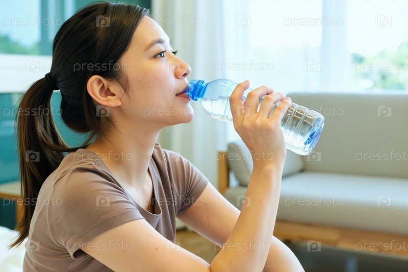 Молодая взрослая азиатская женщина пьет воду из пластиковой бутылки в помещении