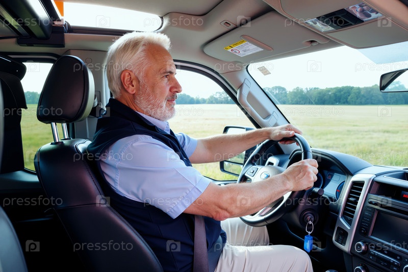 Старший белый мужчина едет на машине по сельской местности днем