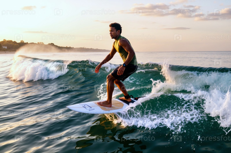 Молодой взрослый чернокожий мужчина занимается серфингом на океанской волне во время Sunset Outdoor Adventure
