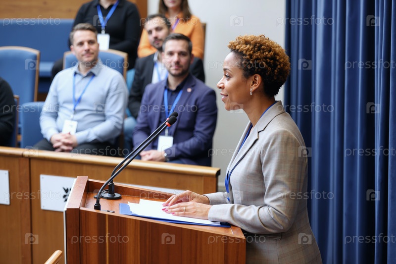Молодая взрослая чернокожая женщина выступает на подиуме во время деловой конференции