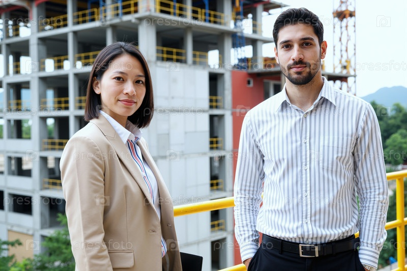 Молодой белый мужчина и молодая азиатская женщина стоят снаружи строительной площадки