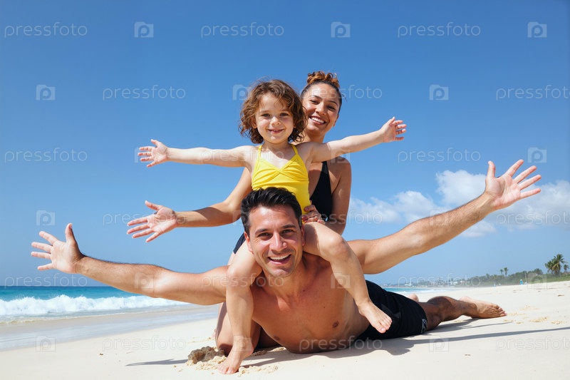 Кавказская молодая семья наслаждается игровыми моментами вместе на песчаном пляже
